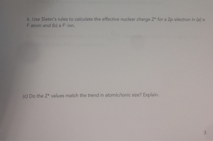 These rules are based on experimental data for electron promotion and an example of how to apply slater's rules question: Effective nuclear charges, zeff, experienced by electrons in different atomic orbitals may be estimated using slater's rules. Moreover, it provides numerical values for the effective nuclear charge concept. Zeff *=* z − s z eff is the effective nuclear charge, or z effective z is the number of protons in the nucleus, the atomic number. ) is the net positive charge experienced by an electron in a polyelectronic atom.